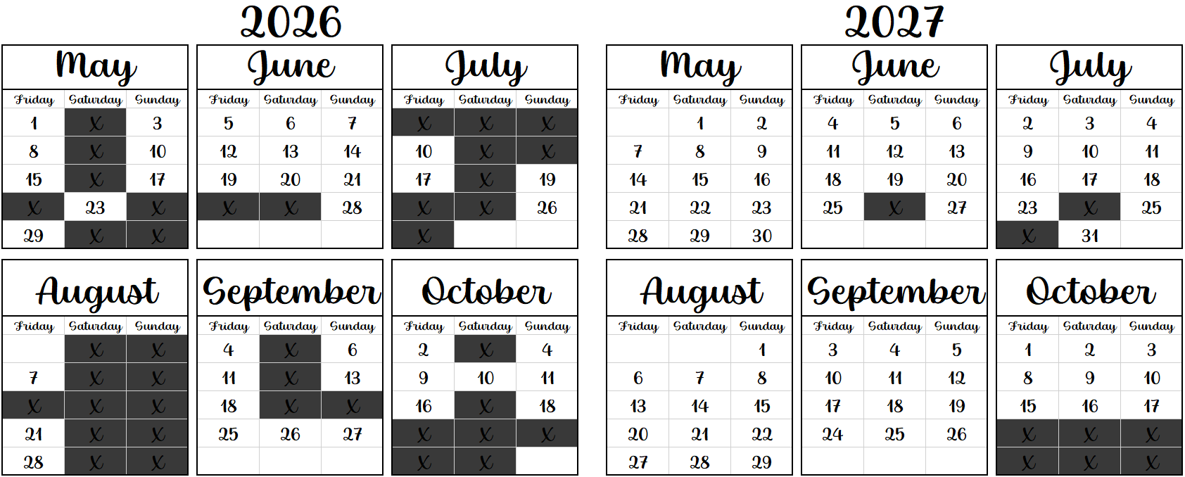 Our wedding season is May - October. Availability can be found below as well as contacting us with specific dates or weekends in mind.
